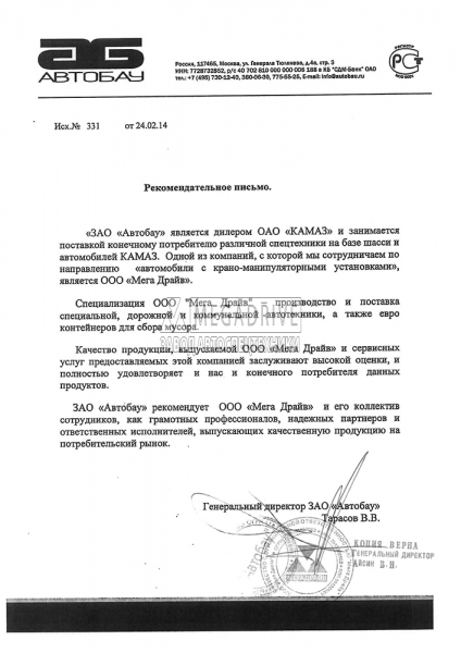 ЗАО "Автобау" рекомендует ООО "Мега Драйв" и его коллектив сотрудников, как граммотных профессионалов, надежных партнеров и ответственных исполнителей, выпускающий качественную продукцию на потребительский рынок.